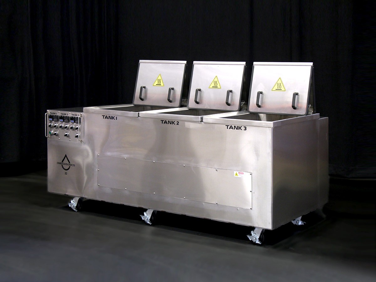 Stark Industrial manufacturers a variety of custom machined parts with small and micro holes for a variety of industries including aerospace, food, machine tool and medical. These unique parts require the utmost in cleaning before they ship to their clients. The custom multi-stage X3 ultrasonic wash system provides an ultrasonic wash, ultrasonic rinse and final stage ultrasonic rinse for the cleanest finished parts available.