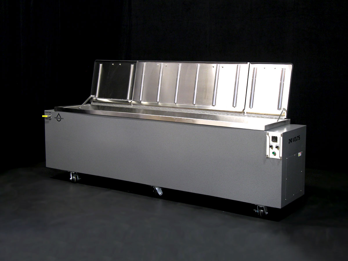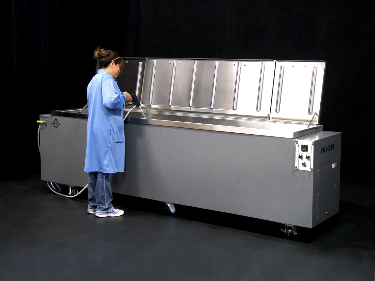 Power Pro 8000 standard ultrasonic wash unit requiring a custom length heated rinse tank to remove cutting fluids, oils, soap residue and machining debris from extremely high-end aerospace and rocket parts after cleaning. The finished parts required absolute surgical level cleanliness to insure proper deployment.