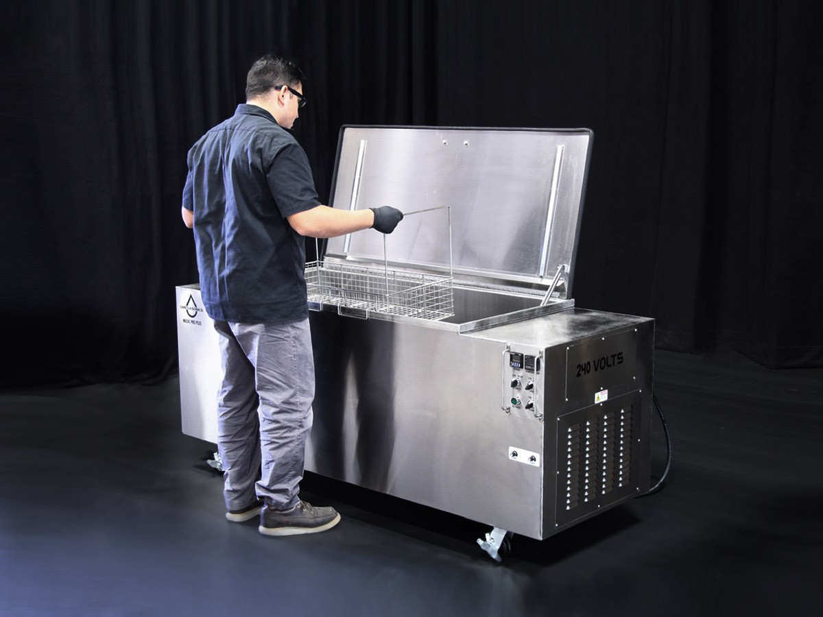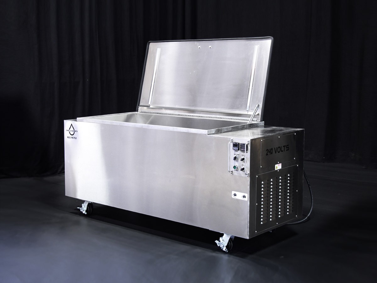 The Music Pro Plus musical instrument ultrasonic cleaner contains a 110-gallon capacity tank that larger music shops use to process large instruments and parts without having to disassemble more than the valves. Bell housings from tubas can be dipped in one easy step.