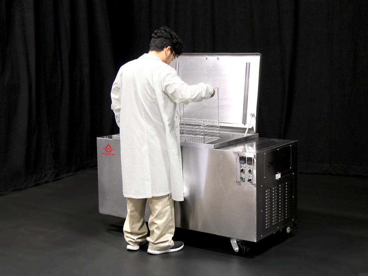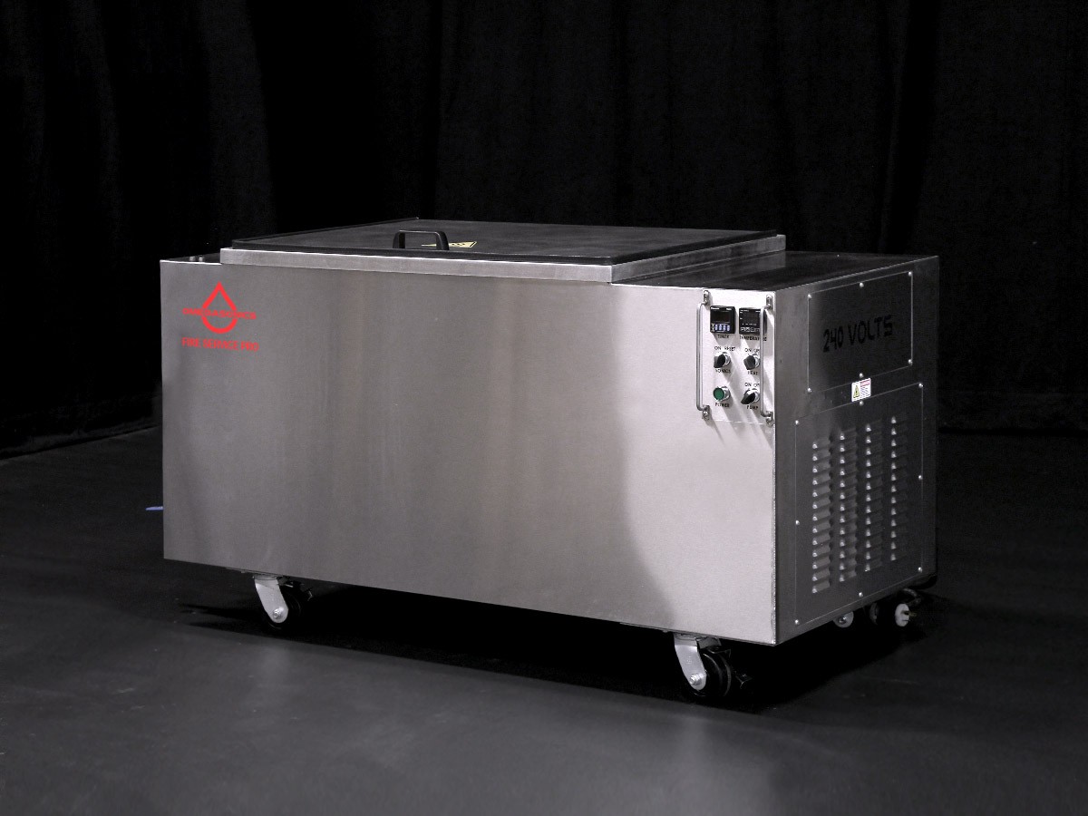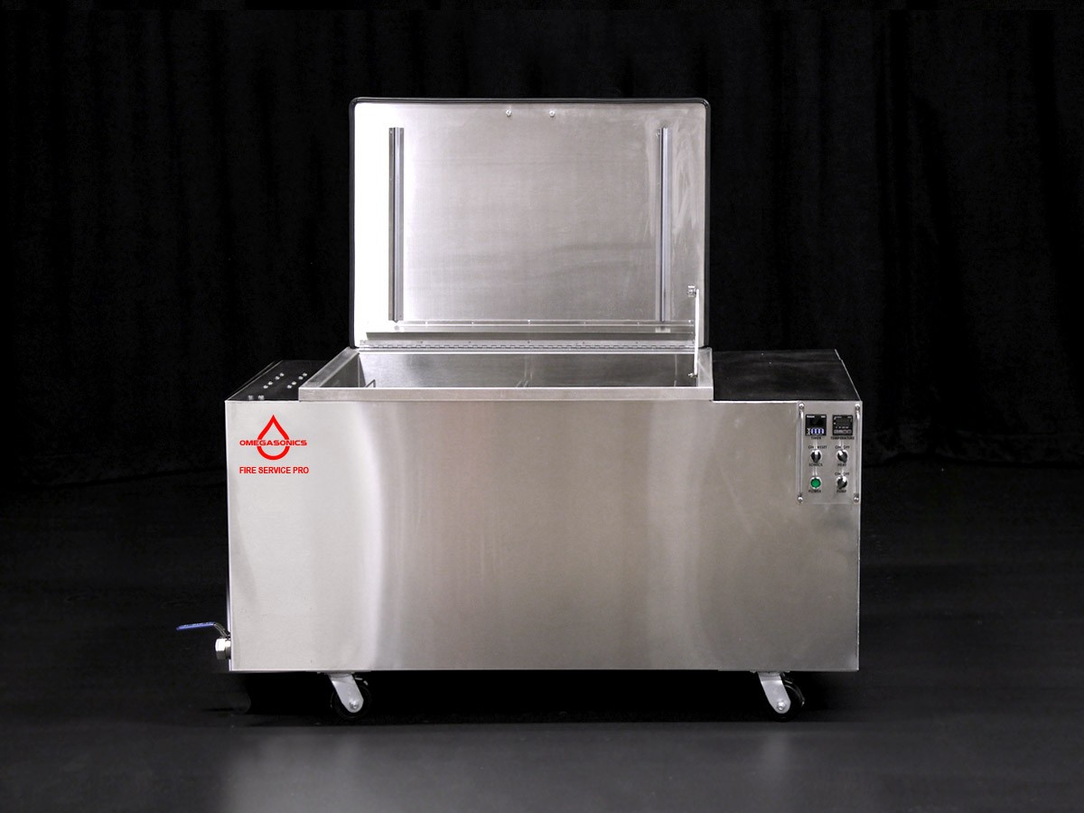 The Fire Service Pro, a 75-gallon portable ultrasonic cleaner, is our most popular model servicing the Personal Protective Ensemble marketplace. The unit capacity can process multiple helmets or boots in one cleaning cycle. Because of it’s 59” x 27” footprint, it can be easily moved within your facility or into the field. Designed to work exclusively with our Omega AquaClean LPH formula which meets NFPA 1851 standards.