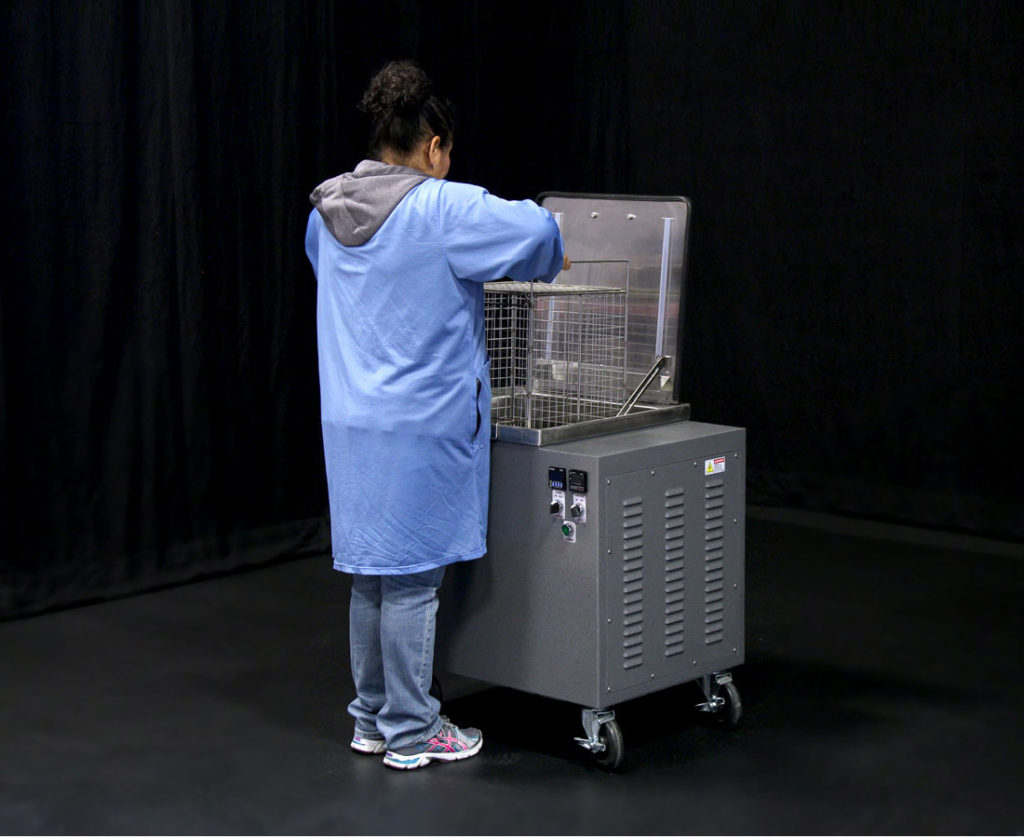 These units have the small size and mobility of tabletop machines, but provide larger capacity options and more cleaning power. The typical frequency used is 40 kHz, but this style of unit also can be custom built at lower and higher frequencies. Bench top units can have tanks as large as 20 gallons, which make them more suitable for high volume. They can be used even in extreme environments, such as out at the site of a natural disaster or wildfire. Bench top tanks are designed for tough or unusual cleaning jobs, and are often used in the machining, automotive, marine and 3D printing industries.