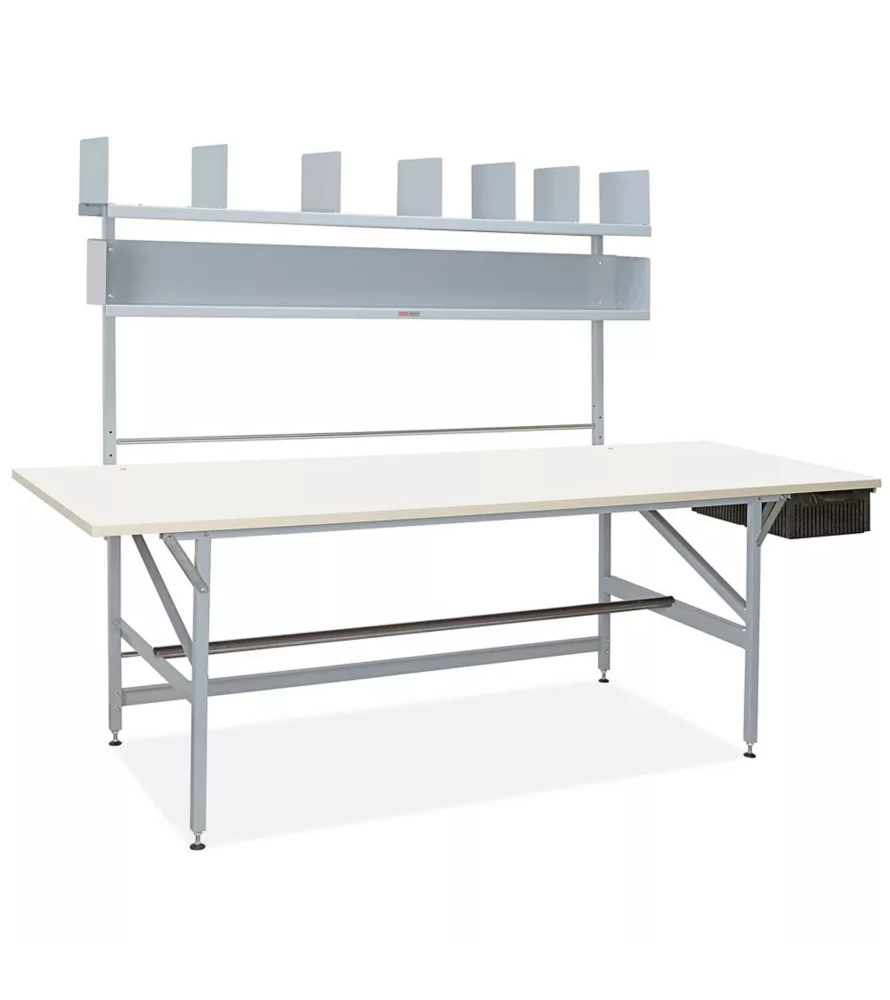 Keep all your packing needs within arm’s length. 8′ table with adjustable leveling feet, 2 shelves, drawer, and heavy duty dowel for rolls. (Hanging racks and paper cutters sold separately)
