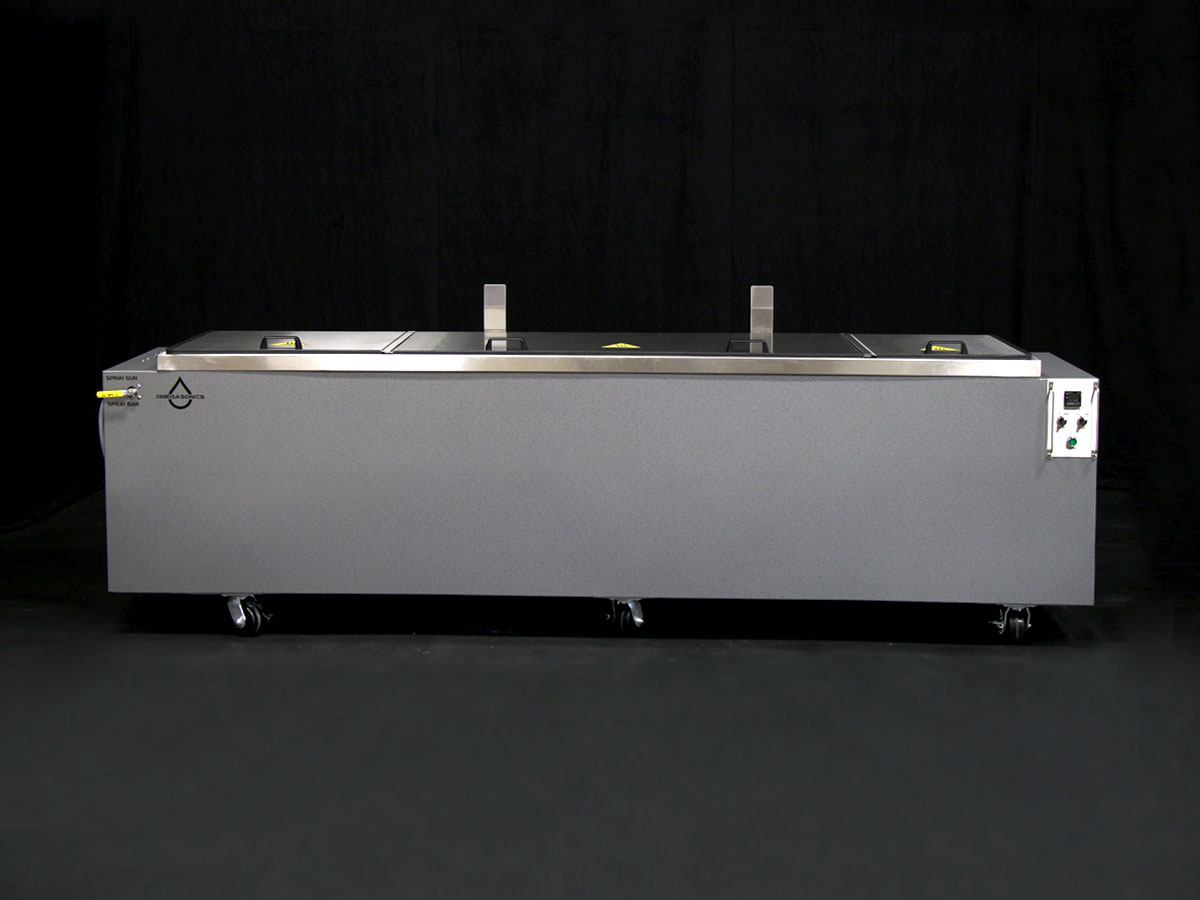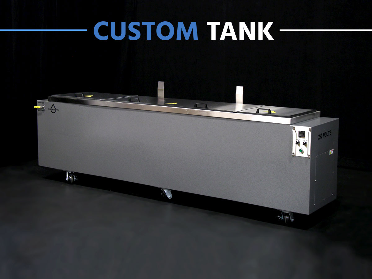 Power Pro 8000 standard ultrasonic wash unit requiring a custom length heated rinse tank to remove cutting fluids, oils, soap residue and machining debris from extremely high-end aerospace and rocket parts after cleaning. The finished parts required absolute surgical level cleanliness to insure proper deployment.