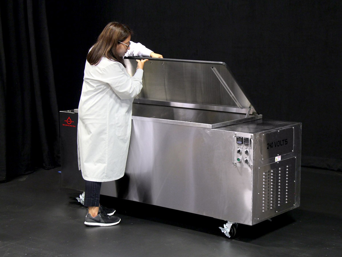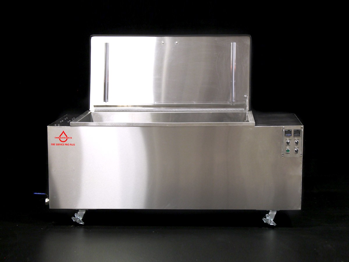 The Fire Service Pro Plus, a 108-gallon portable ultrasonic cleaner, is our most popular model servicing the Personal Protective Ensemble marketplace. The unit capacity can process multiple helmets or boots in one cleaning cycle. Because of it’s 76” x 27” footprint, it can be easily moved within your facility or into the field. Designed to work exclusively with our Omega AquaClean LPH formula which meets NFPA 1851 standards.